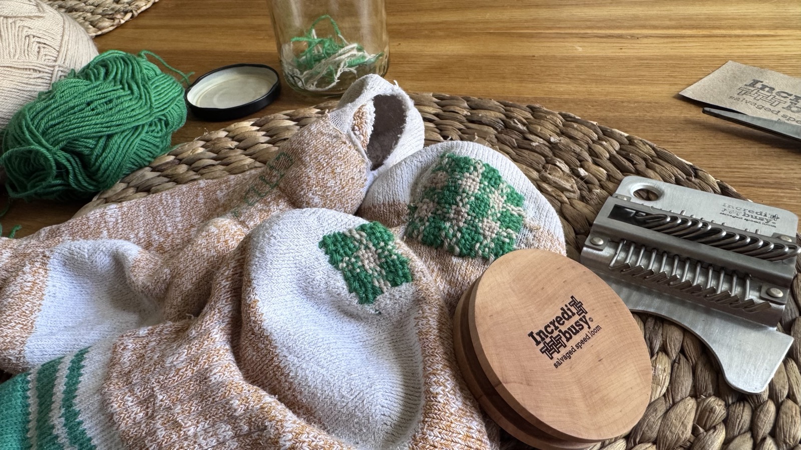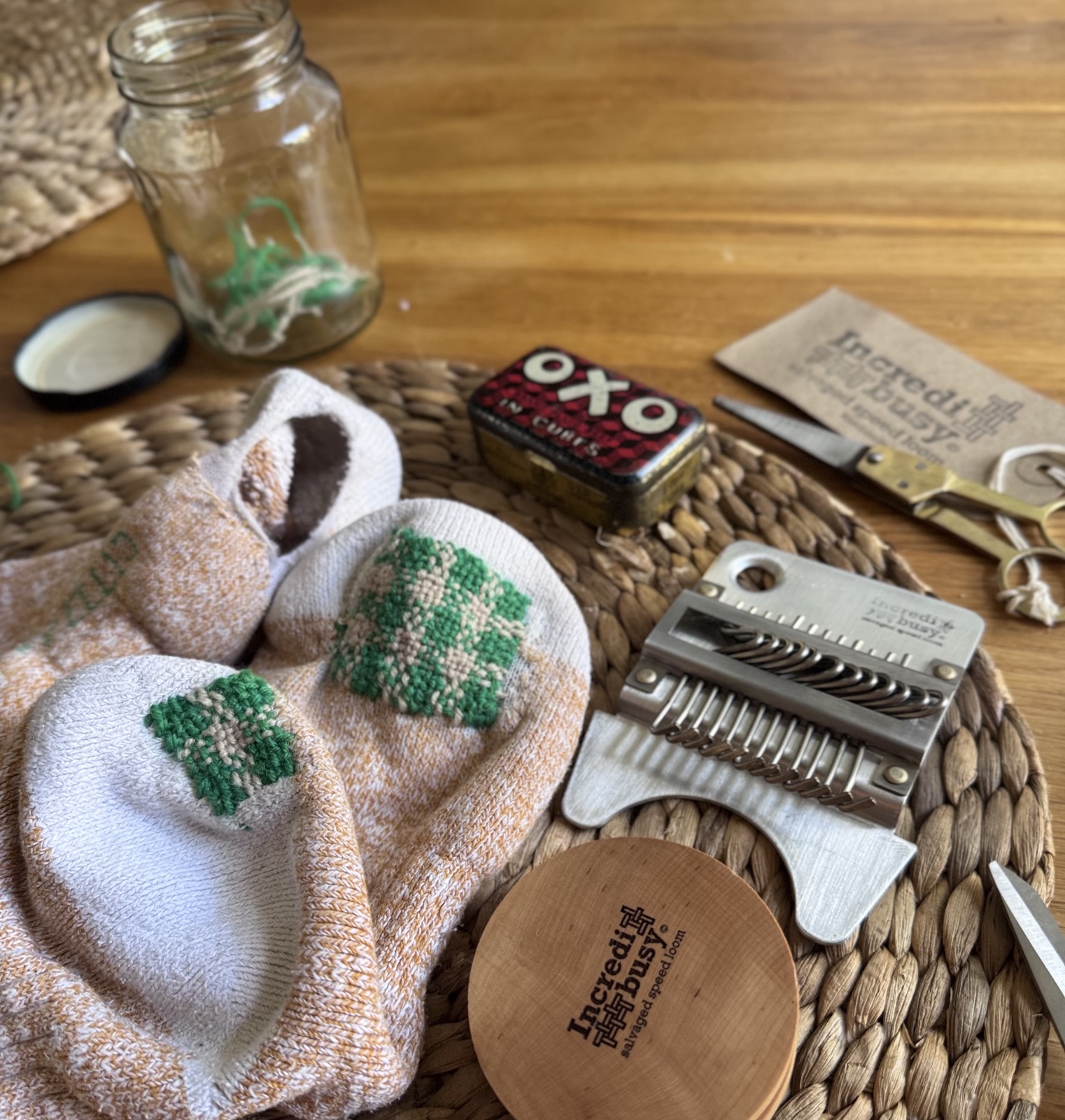 The tutorial focuses on simple techniques to build confidence with the loom. If you’d like to go further, exploring more advanced methods or working on knitwear beyond socks, you can join one of my in-person workshops or book a live one-to-one session online. More details are available at incredibusy.com.